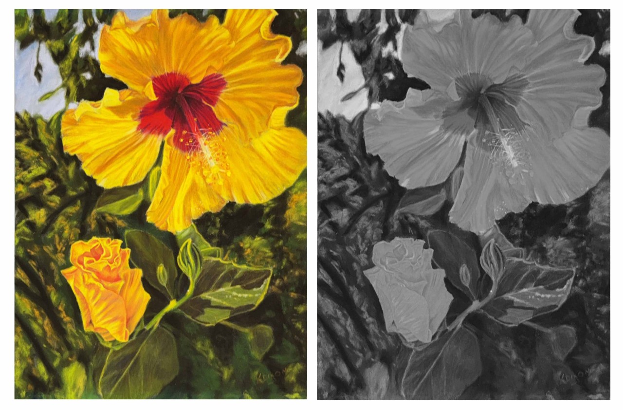 For example: If you took a black and white photograph of your painting, the shades of grey would be the different values or tones within the painting, or another way to word it would be ‘the tonal values within the painting’. It is always great practice to look at the tonal values within your painting as they can be used to lead a viewers eye and create a great composition. They are also what gives us the ability to create that 3 dimensional look. Value is the lightness or darkness of a colour or hue.